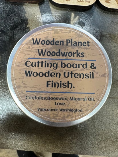Wooden utincil finish hand made with all narural Ingredients. 2oz. container will last for many coats on your favorite cutting board on spatula.